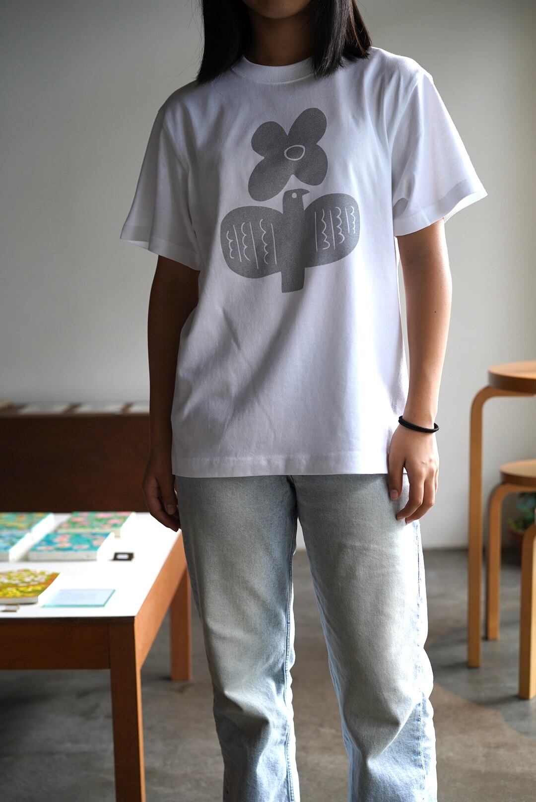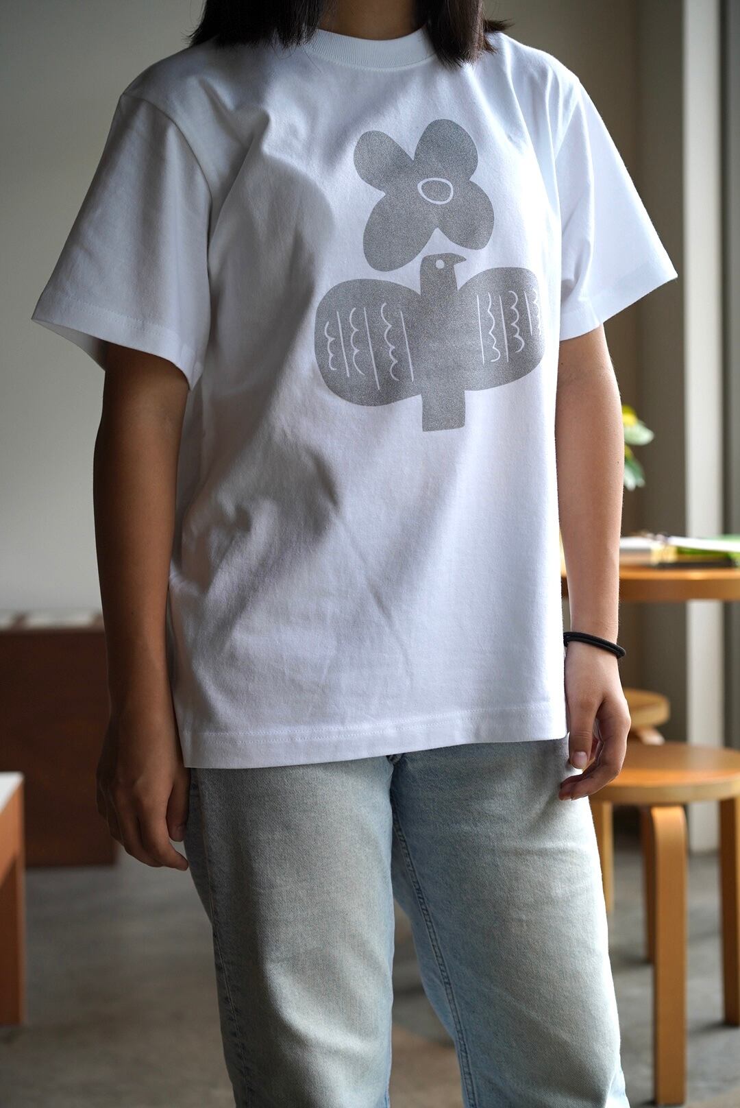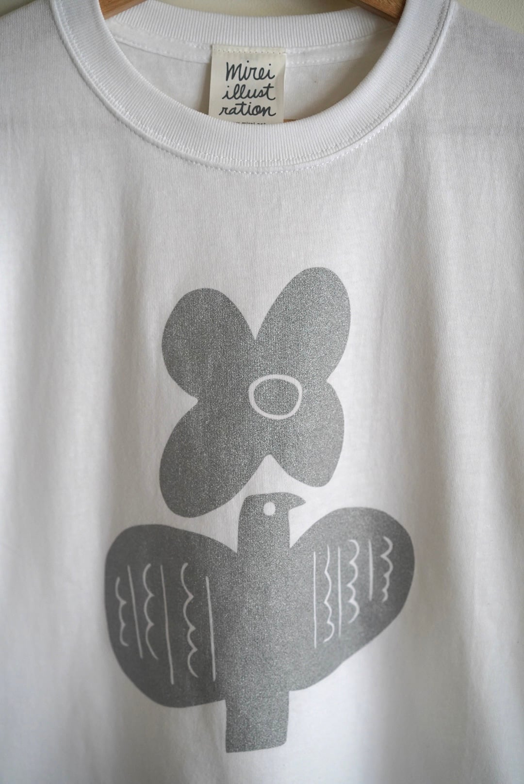 ホワイトのTシャツに光沢のあるシルバーのインクが